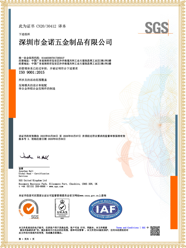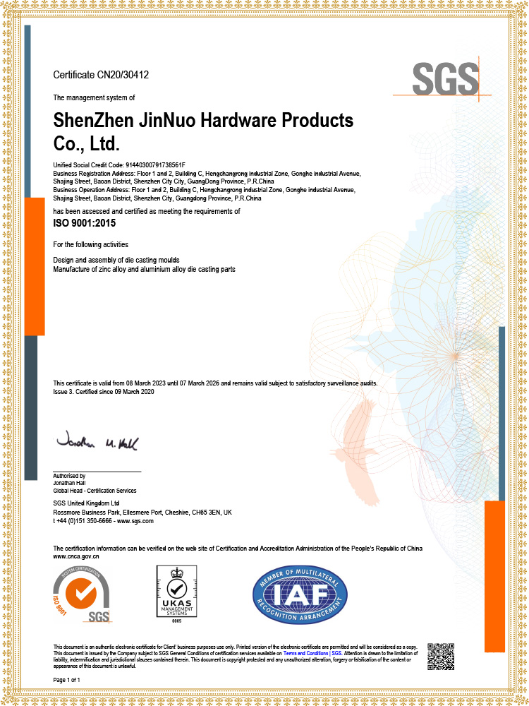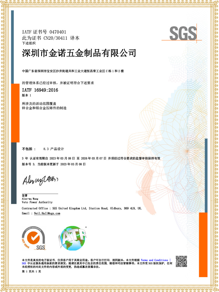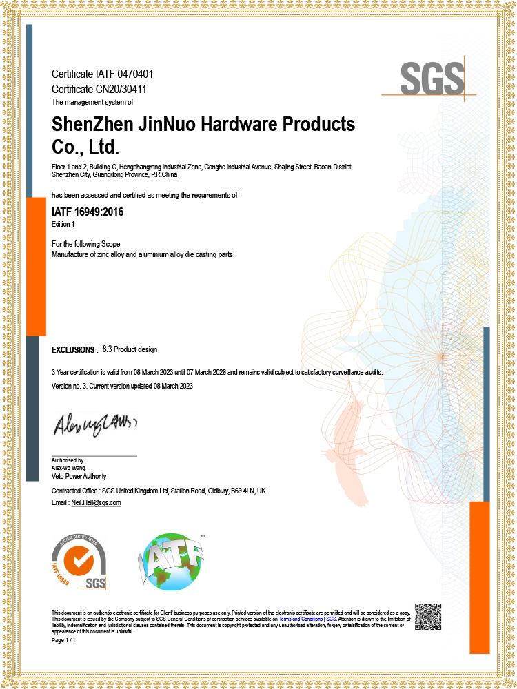 Based on 20 years of accumulation in the field of precision zinc/aluminum metal die-casting, our company has passed the rigorous audit of SGS, a global authoritative organization, and successfully obtained the IATF16949 automotive industry quality management system and ISO9001:2000 quality management system certification. Certification covers the entire business chain of mold design and manufacturing, precision die-casting, CNC precision machining, post-treatment, and surface treatment, with international standards controlling the quality of every link. It meets the high requirements for precision and stability in fields such as automotive and high-end manufacturing, and provides customers with authoritative recognition and practical guarantee of product services.